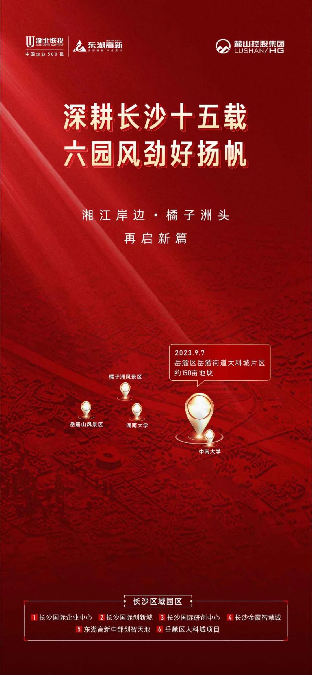 2023年9月7日,武漢東湖高新集團股份有限公司攜手長(cháng)沙麓山投資控股集團有限公司摘得長(cháng)沙市約150畝產(chǎn)業(yè)地塊,雙方將共同打造高端產(chǎn)業(yè)園區項目。