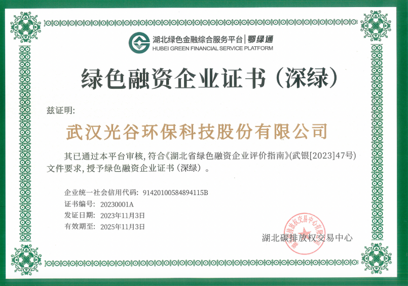 公司旗下光谷環(huán)保憑借氣水領(lǐng)域環(huán)保設施的精細化運營(yíng)和節能減排措施的落實(shí),成功獲得綠色融資企業(yè)證書(shū)(深綠),成為首批獲評的湖北綠色融資企業(yè),在貸款利率、授信額度、貸款期限等方面將獲得更多的融資支持。
